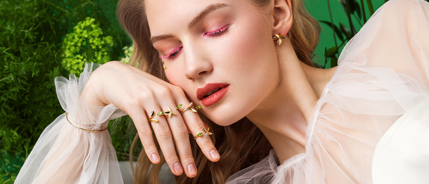 В коллекции представлены жесткие браслеты, кольца, серьги и колье из желтого золота 585 пробы с бриллиантами и хризолитами. Украшения повторяют нежные цветочные мотивы, изящность и плавность природных линий, которые подчёркивает древний драгоценный камень хризолит истинно-природного зеленого оттенка.